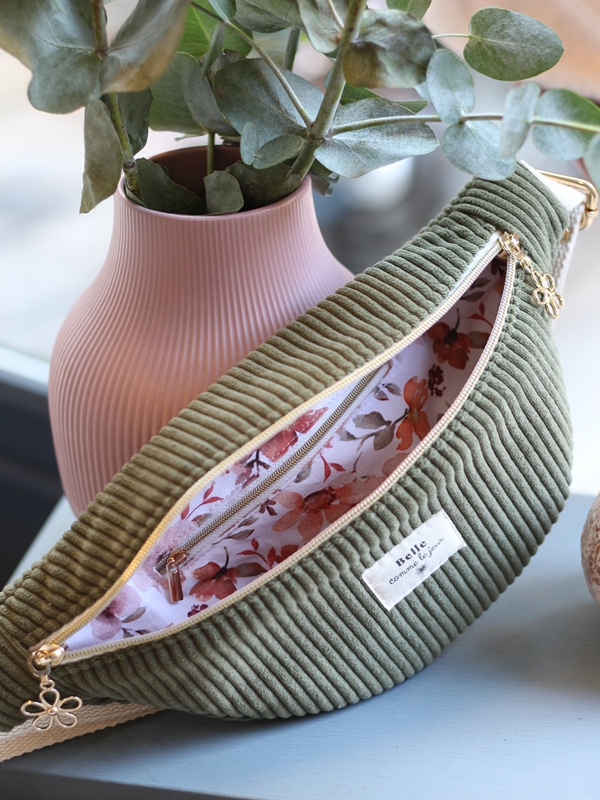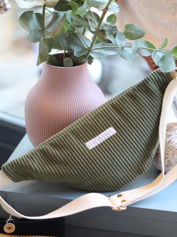 Conçu en velours côtelé, popeline de coton intérieure, sangle écrue réglable, ce sac allie fonctionnalité et style.